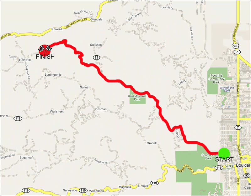 So tomorrow I’ll be taking on my first hill climb race (on a road bike) of 2007. This is one of the many prep races I’ll be doing before I master Mt. Washington in New Hampshire in August. This race begins in Boulder and winds up Sunshine Canyon and concludes at the city limits of Gold Hill. I don’t really know if you could call it a city limit, but it’s the highest point in the town of Gold Hill. Anyways, the racing (eh…suffering?) begins at the crack of 8:05AM tomorrow. The race is only 9 miles in length, however it will climb a grueling 3,000 vertical feet. This is still a snoozer compared to Mt. Washington, but it will be hard!